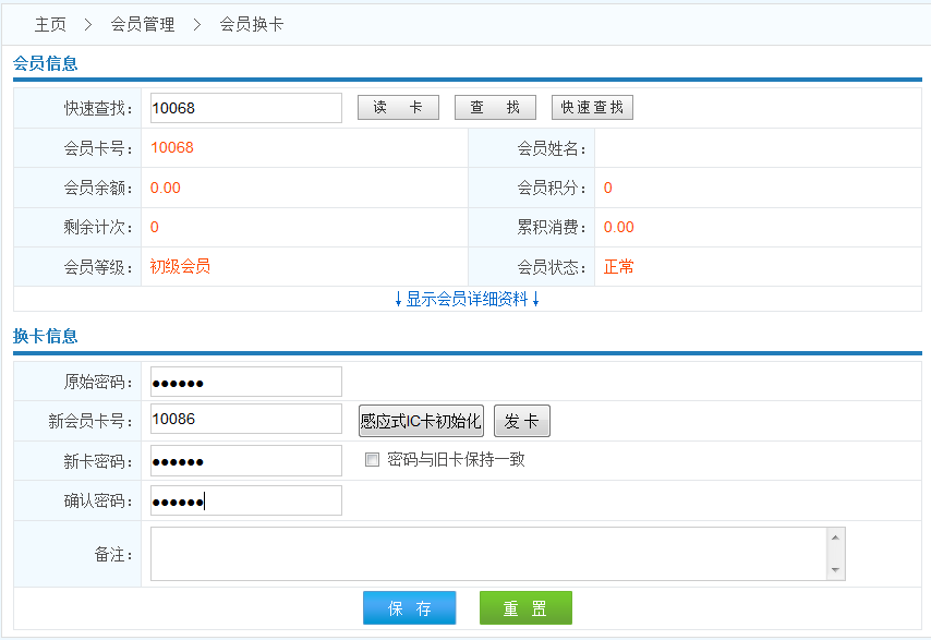 2.本操作用于會(huì)員更換新卡操作,換卡支付費(fèi)用不在卡內(nèi)扣款,要收取現(xiàn)金.