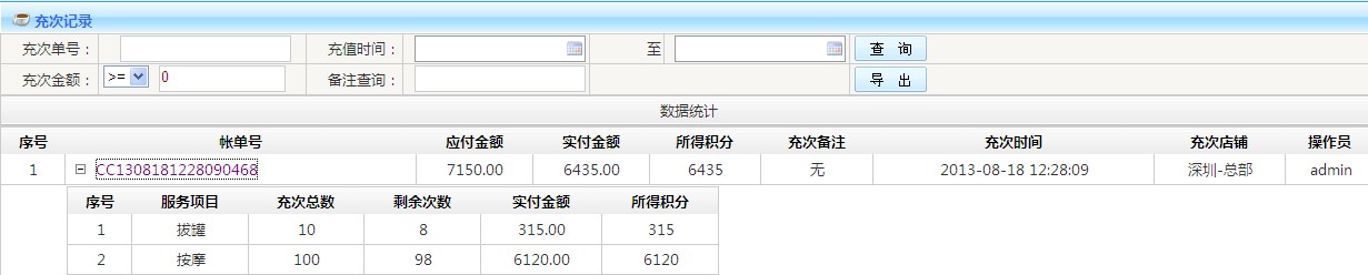 :查詢會員自己的充次記錄并可以導出Excel文檔