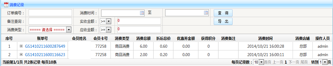 消費(fèi)記錄: 1.查詢:可以根據(jù)消費(fèi)單號(hào) 時(shí)間段 消費(fèi)類(lèi)型等條件查詢 2.導(dǎo)出:可以將按條件查詢出來(lái)的數(shù)據(jù),以Excel表格形式導(dǎo)出 3.列表:雙擊訂單號(hào),如果有消費(fèi)詳情的可以查看消費(fèi)詳情