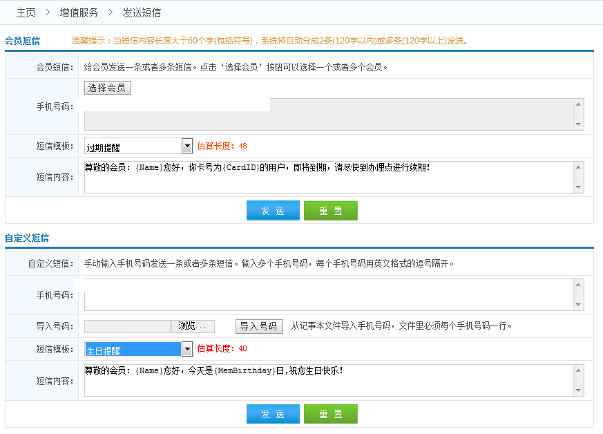 發(fā)送短信:給會(huì)員發(fā)送祝福、通知短信等等.     注意:當(dāng)短信內(nèi)容長度大于65字符,系統(tǒng)將會(huì)自動(dòng)分成2條或者多條短信發(fā)送...